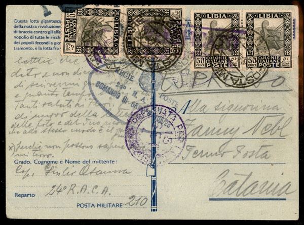 Posta Militare 210 - cartolina postale (in franchigia) per Catania del 9.9.1942 con affrancatura multipla (51 quattro)