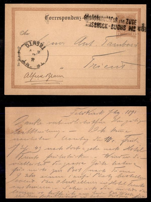 Postconducteur im Zuge Innsbruck Buchs n. 1/401 - cartolina postale da 2 Kreuzer per Trento del 3.7.81