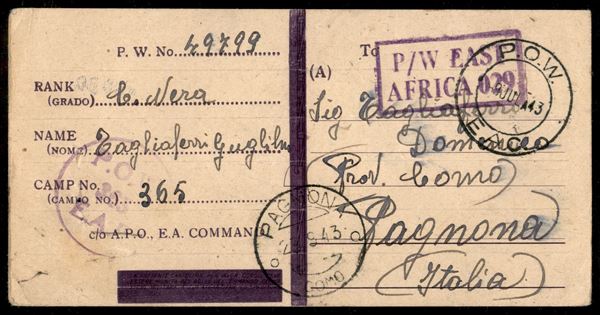 Prigionieri di Guerra - cartolina dal P/W East Africa 029 del 1943 per l'Italia