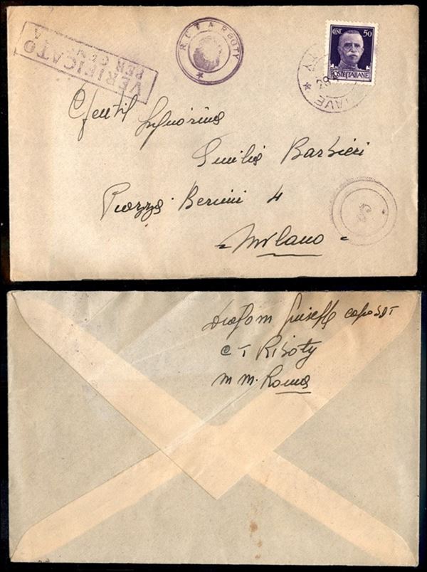 R. Nave Riboty (in viola) su 50 cent (251) - busta per Milano del 28.4.43