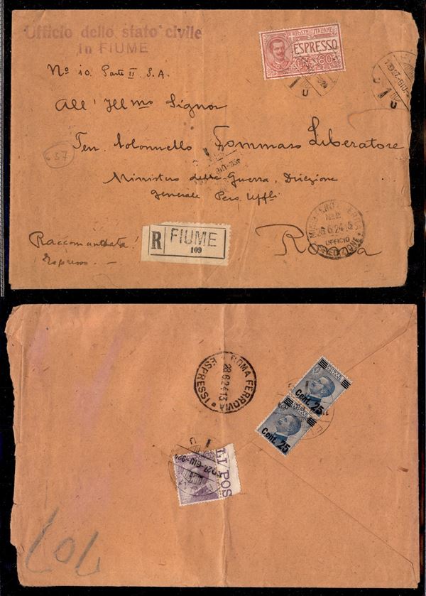 Raccomandata espresso da Fiume a Roma del 27.6.24 con affrancatura fronte retro di Regno (85 + 178 coppia + 7 Espressi)