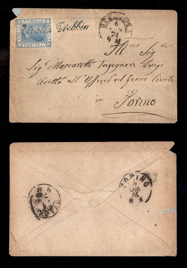 Rivalta Trebbia (verde - P.ti 5) - 20 cent (26) su bustina per Torino via Piacenza (6.7.74)