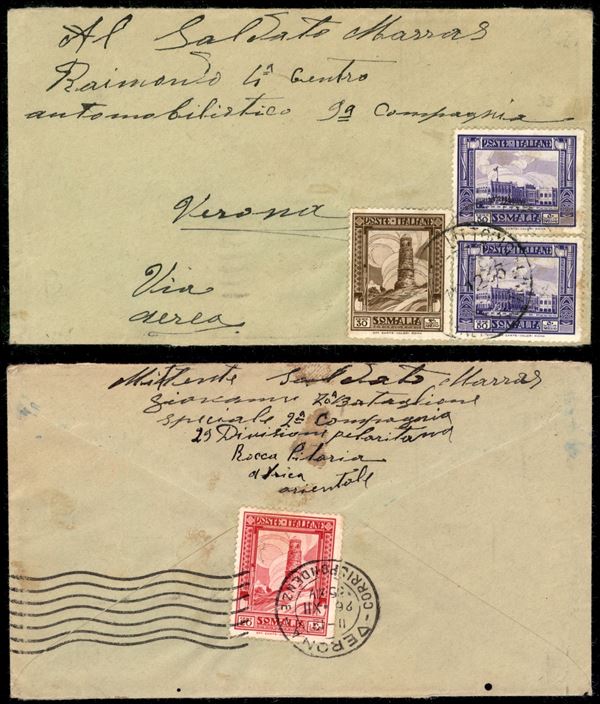 Rocca Littorio 19.12.35 - Aerogramma per Verona con affrancatura multipla fronte retro (219 + due 221 + 220 annullato in arrivo)