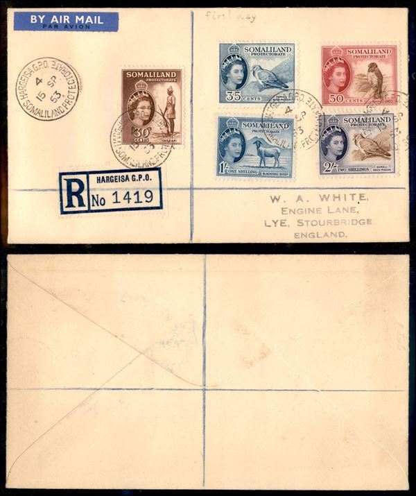 SOMALIA INGLESE - Elisabetta (125/129) – raccomandata FDC da Hargeisa a Lye del 15.9.53