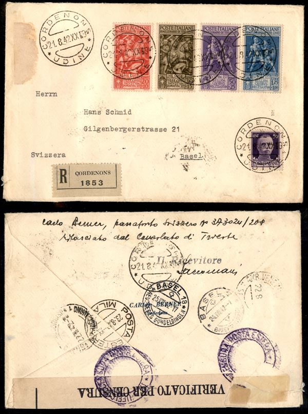 Tito Livio (458/461) + complementare (251) - raccomandata da Cordenons a Basilea del 21.8.42 - censure
