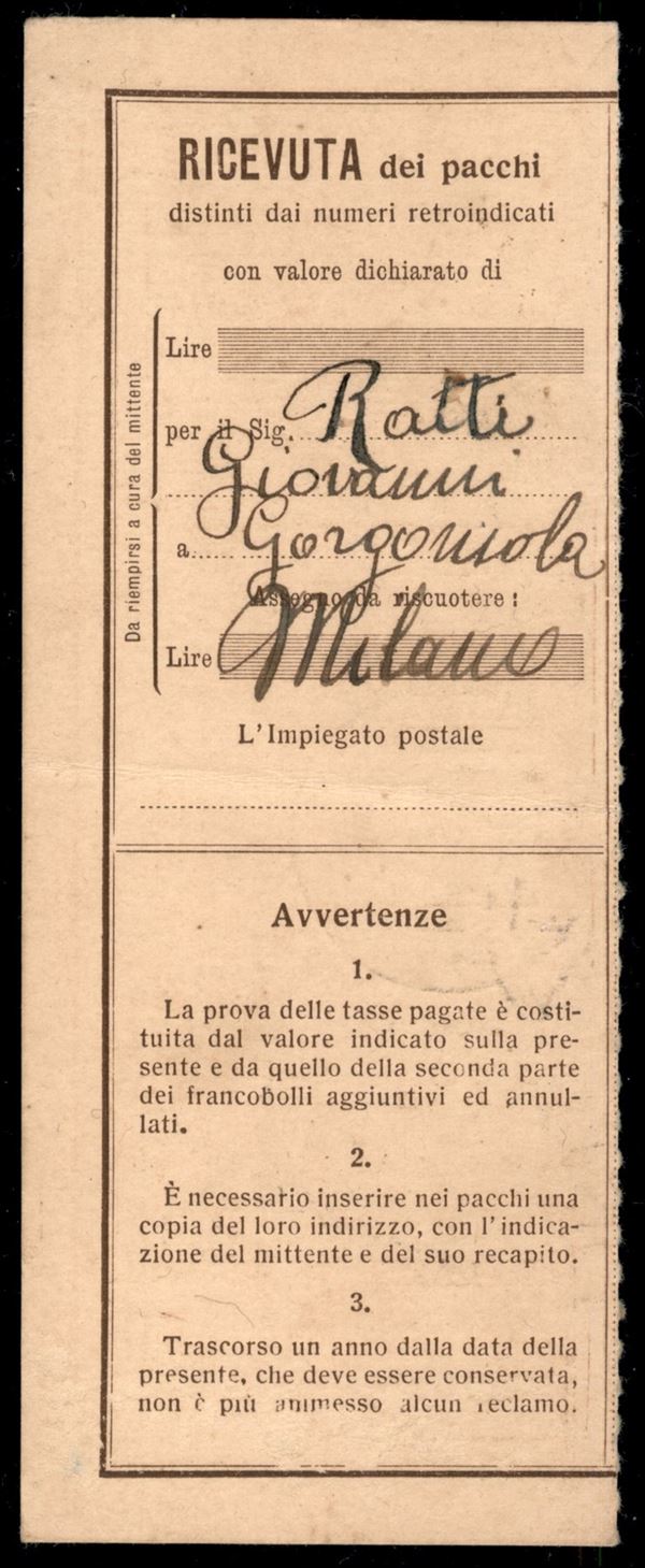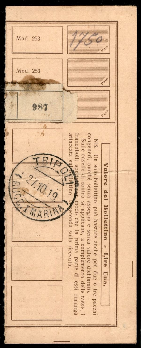 Tripoli (Succ. I Marina) 27.10.19 - ricevuta di pacco per Milano - piega centrale