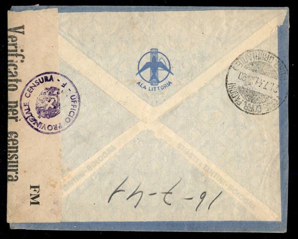 Ufficio Provinciale Censura - unico annullatore su coppia del 50 cent (51) - aerogramma per Firenze del 16.7.1941