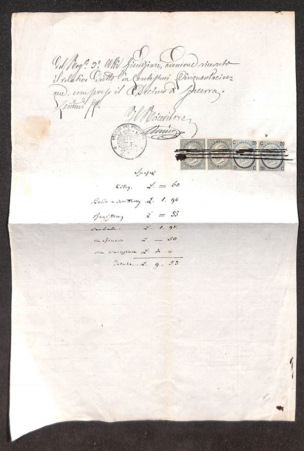 Uso fiscale - due 5 cent De La Rue (16) + coppia del 20 cent su 15 (23) annullati a penna su documento