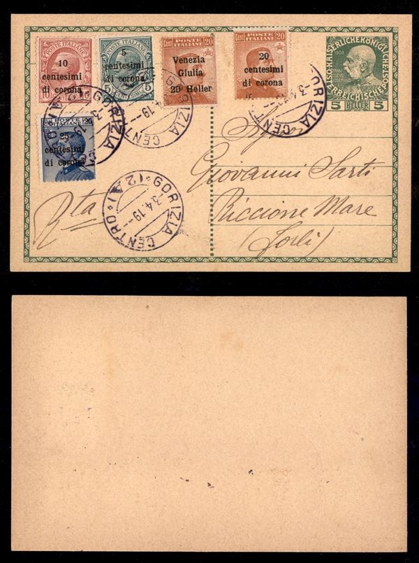 Venezia Giulia (31) + Trento e Trieste (3/6) su intero postale (austriaco) da Gorizia a Riccione del 3.4.19