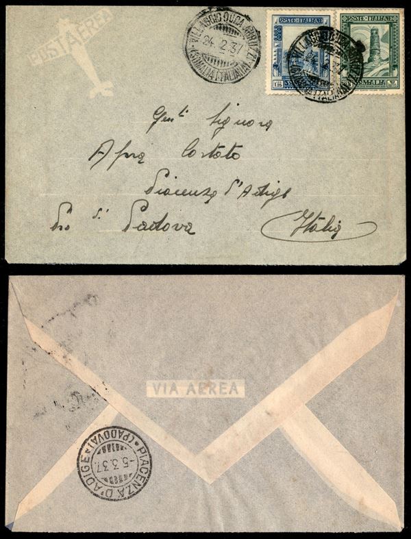 Villaggio Duca degli Abruzzi (Somalia Italiana) 24.2.37 - 1.25 lire + 25 cent Pittorica (223+218) - aerogramma per Padova