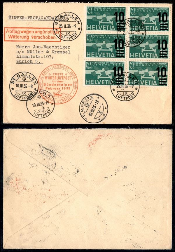 Winterluftpost – blocco di sei del 10 su 15 cent (A20) su aerogramma da St. Gallen a Zurigo del 25.2.35