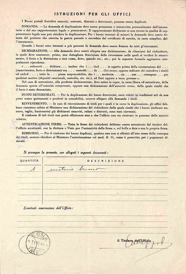 1 lira Imperiale (252A) isolato su intera Domanda di Duplicazione (Mod. B.I. 5) - Egna/Trento 11.10.43