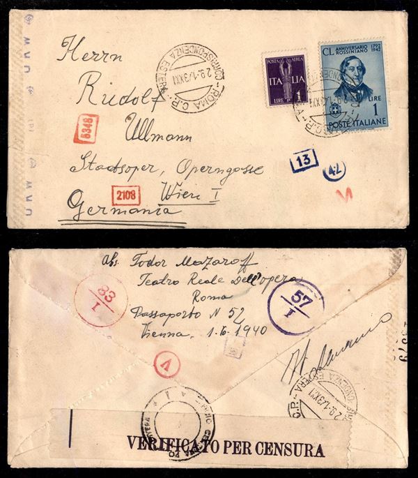 1 lira Rossini (469) + 1 lira Aerea (14) - busta da Roma a Vienna del 29.1.43