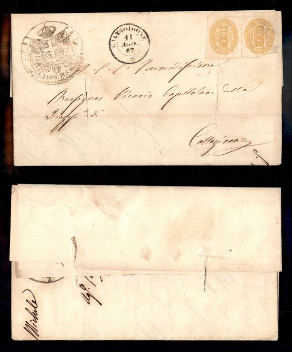 10 cent segnatasse (1) - coppia verticale non annullata su lettera da S.Michele a Caltagirone del 10.8.67 con tagli di disinfezione