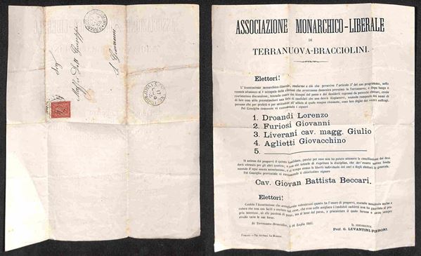 1885 - Associazione Monarchico Liberale di Terranuova Bracciolini - volantino elettorale a stampa per S. Giovanni del 17.7.82 col 2 cent (15)
