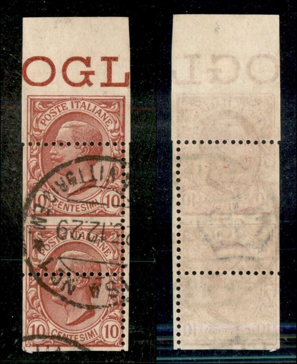 1906 - 10 cent Leoni (82) con dentellatura orizzontale spostata in basso (1 centimetro) - coppia verticale bordo foglio usata - ritagliata con le forbici - non catalogata