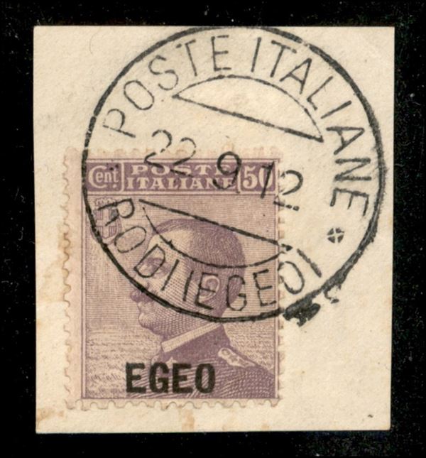 1912 - 50 cent (2) usato su frammento a Rodi nel giorno d'emissione (22.9.12)