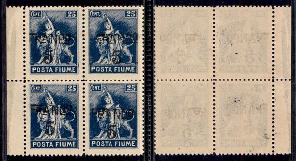 1919 - Franco 5 su 25 cent (D76) in quartina - gomma integra - soprastampe disallineate