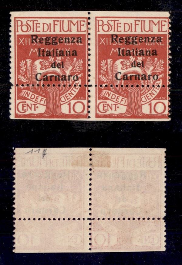1920 - 10 cent (134) - coppia con dentellatura orizzontale spostata in alto (varietà zmda) - senza gomma - non catalogato