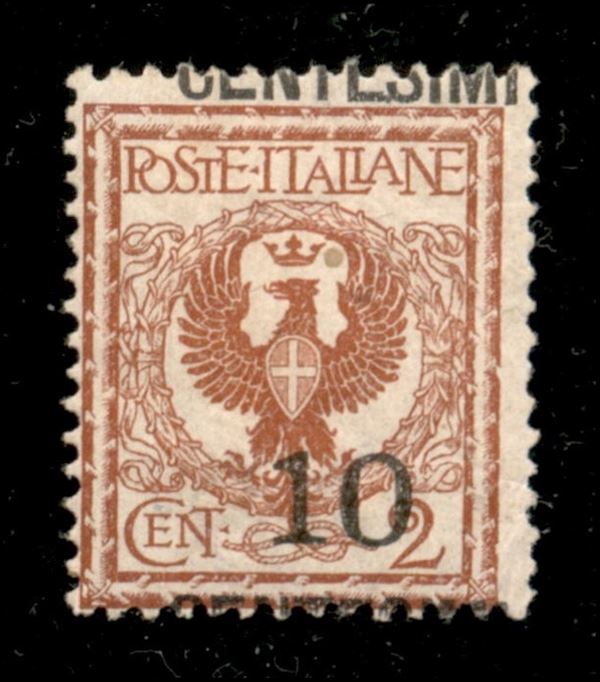 1923 - 10 cent su 2 Floreale (138l) - soprastampa fortemente spostata in basso "Centesimi in alto a cavallo e 10 in basso" + lieve spostamento a destra - gomma originale con traccia di linguella