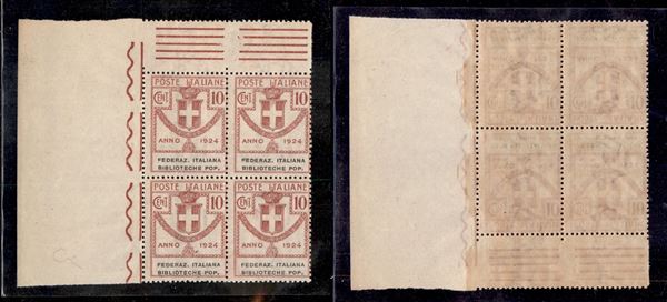1924 - 10 cent Biblioteche Pop. (34) - quartina angolo di foglio - gomma integra (300+)