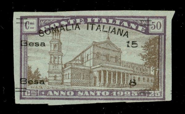 1925 - Prova di Macchina - 15 besa su 50 cent Anno Santo (tipo 63) su carta azzurra - non dentellato - senza gomma - piega verticale