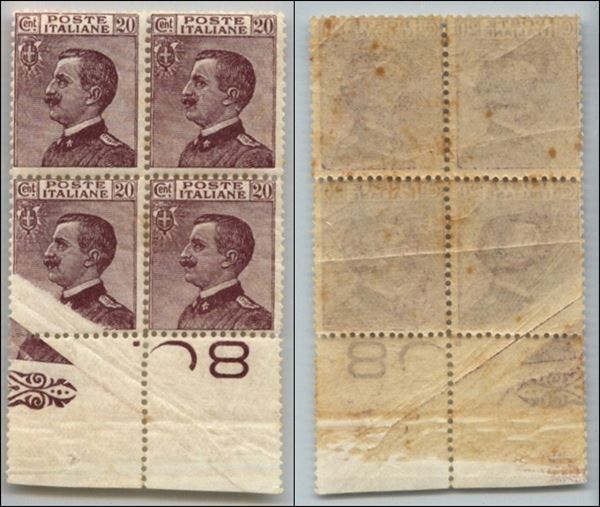 1926 – 20 cent Michetti (204) – quartina bordo foglio con grande piega naturale di carta in angolo a sinistra – gomma integra – piega orizzontale al centro – punti gialli