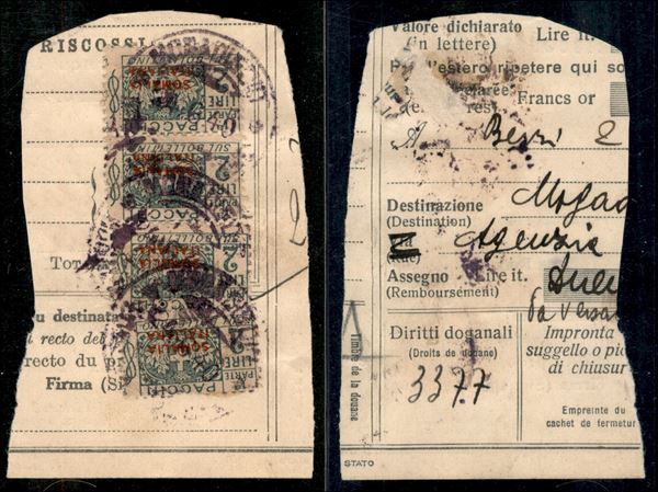 1926 - 2 lire Pacchi (36 madre) - quattro metà sinistre usate su frammento di Bollettino - Mogadiscio 24.6.40 (violetto)