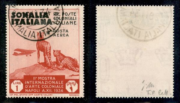 1934 - 1 lira Arte Coloniale Posta Aerea (5) usato - filigrana lettere 10/10