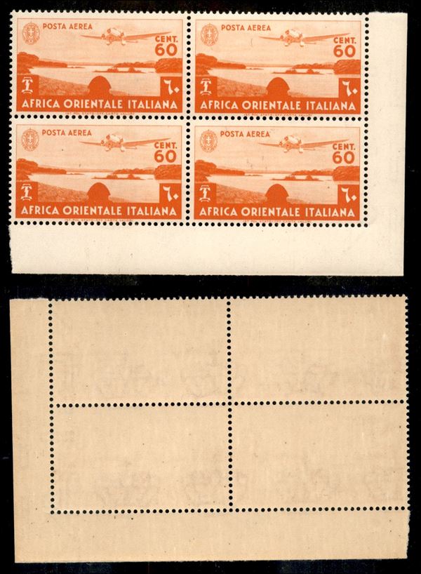 1938 - 60 cent Posta Aerea (3) - quartina angolare con filigrana lettere (8/10) a destra - gomma integra