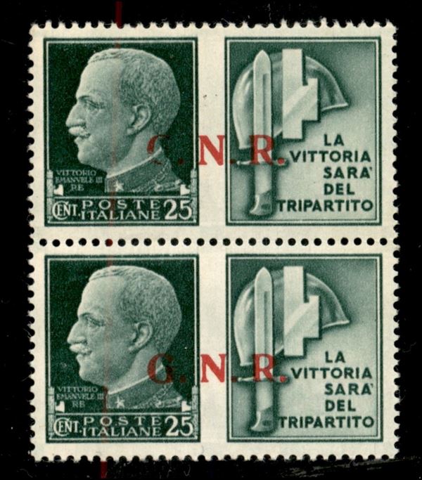 1943 - 25 cent Milizia (16/Ieea + 16/I) in coppia - pos. 52 (G parziale + N punto piccolo) + pos. 57 - gomma integra