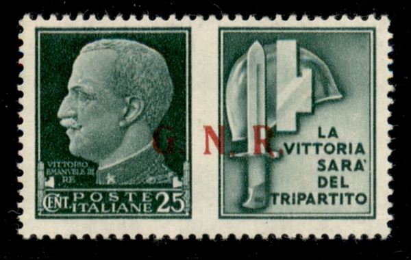 1943 - 25 cent Milizia (16/IIei varietà) - tre punti piccolo + punto piccolo basso dopo N - gomma integra - non catalogato