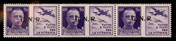 1943 - 50 cent Aviazione (23/I varietà ed + 23/I + 23/Ief) - striscia di 3 - punto piccolo dopo G a sinistra + punto piccolo dopo R a destra - gomma integra