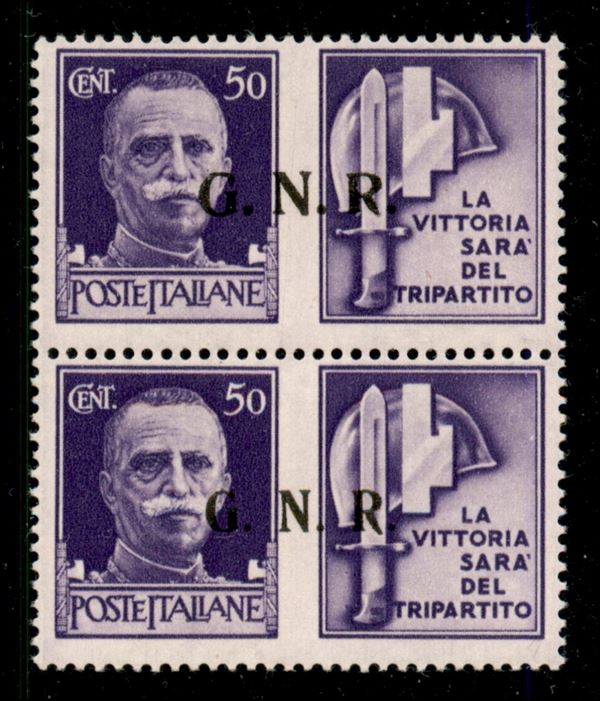 1943 - 50 cent Milizia (24/I + 24/II) coppia verticale con i due tipi di soprastampe - gomma integra (225)