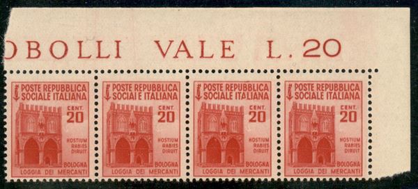 1944 - 20 cent Monumenti distrutti (504aa - pos.8) - varietà SOCIAIE - striscia di 4 angolo di foglio con 3 normali (Pos. 7+9/10) - gomma integra