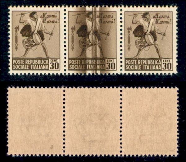 1944 - 30 cent (498) - striscia di 3 - grande taglio chirurgico verticale sul pezzo centrale - gomma integra