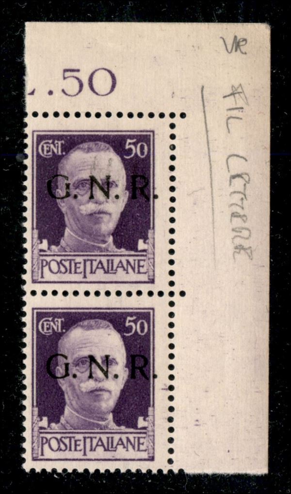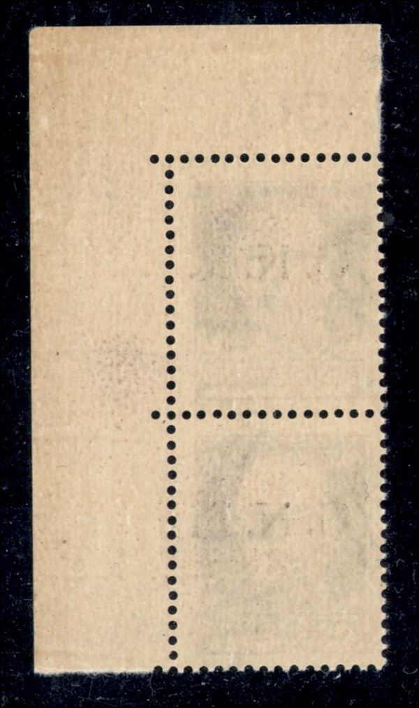 1944 - 50 cent (477) - coppia angolare (pos. 10/20) con filigrana lettere 12/10 - gomma integra