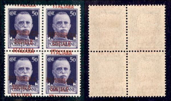1944 - 50 cent (493h) in quartina con soprastampe oblique - gomma integra (traccia di linguella in alto a destra)
