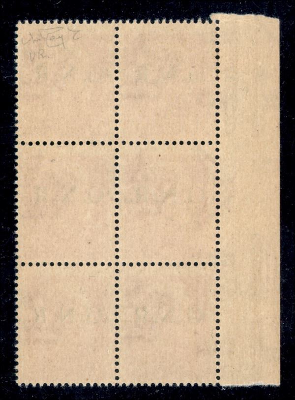 1944 - 75 cent (478 - varietà) - blocco di 6 bordo foglio con filigrana lettere a cavallo - soprastampa slittata (effetto doppia soprastampa) - gomma integra - Raybaudi