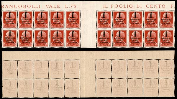 1944 - 75 cent (494) - blocco di 20 (pos. 6/20 + 101/115) con interspazio al centro - gomma integra