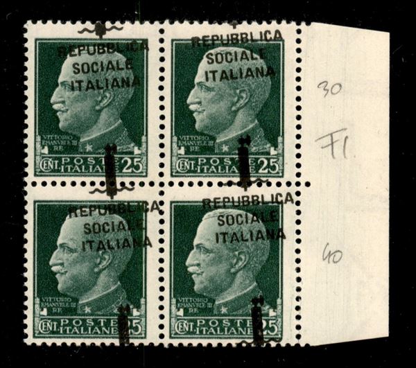 1944 - Firenze - 25 cent (491h) - quartina bordo foglio (pos. 29/40) con soprastampe oblique - gomma integra