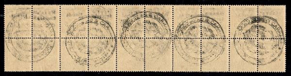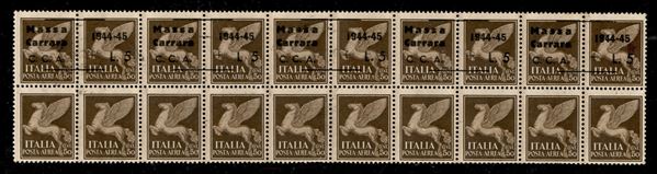 1945 - 5 lire su 50 cent Aerea (Errani 2+2b+2a+2+2) - intera striscia orizzontale di cinque - errore L punto piccolo (pos.2) + punto quadrato (pos.3) - gomma integra - Raybaudi