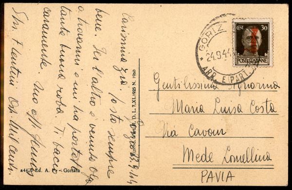 30 cent (492E) con fascio rosso arancio - cartolina da Gorizia a Pavia del 24.9.1944