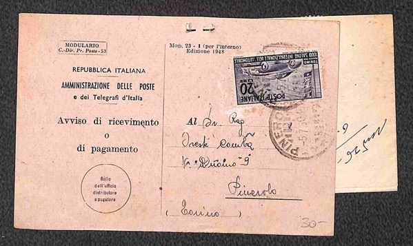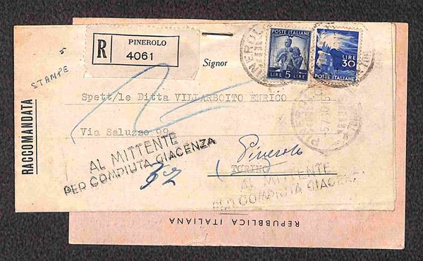 5 lire + 30 lire Democratica (555 + 563) su raccomandata da Pinerolo 5.7.50 ritornata al mittente con applicata al verso la ricevuta di ritorno affrancata 20 lire (617) - inusuale