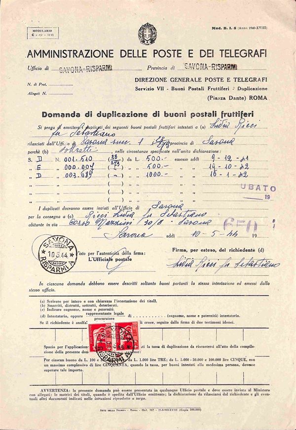 5 lire Imperiale (257) - coppia su intera Domanda di Duplicazione (Mod. B.I. 5) - Savona 10.5.44