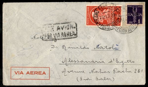 75 cent Pergolesi + 1 lira Posta Aerea Miti e Simboli (431 + Aerea 14) su lettera via aerea da Milano per Alessandria d'Egitto del 20.11.37 - con bolli d'arrivo