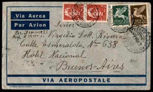 Aerogramma affrancato con coppia verticale del 2 lire Imperiale (255) + 50 cent Imperiale Aerea (11) + 5 lire Imperiale Aerea (16) da Genova per Buenos Aires del 29.12.34
