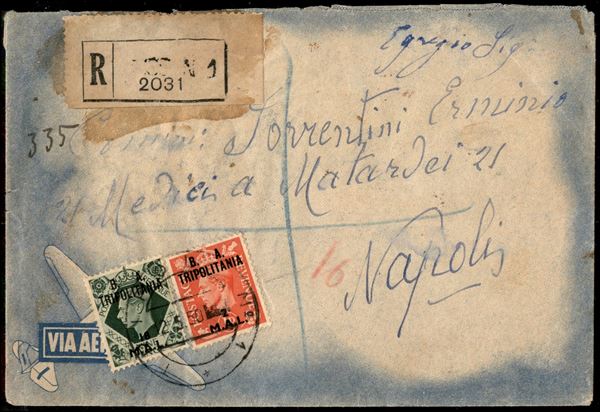 Aerogramma raccomandato da Tripoli (N.1) a Napoli del 12.5.50 (15+22)