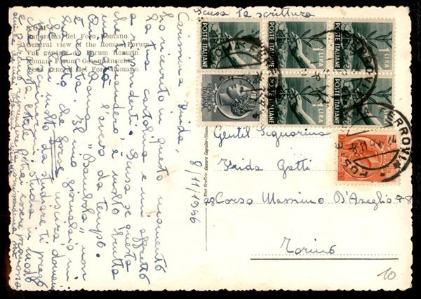 Affrancatura mista - 1 lira Democratica (quartina + singolo) + 5 lire filigrana stelle e 10 lire Siracusana (550 + 762 + 764) su cartolina da Roma a Torino del 8.11.956 - inusuale