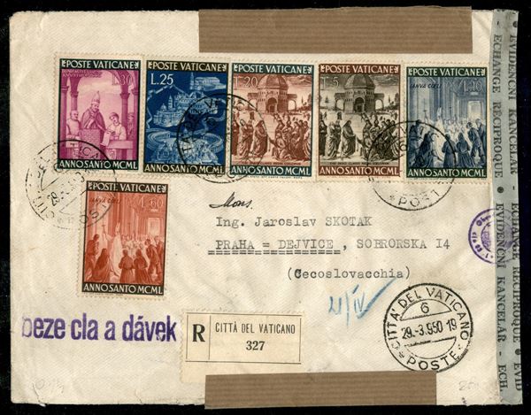 Anno Santo sei valori (132 + 135/39) su raccomandata del 29 marzo 1950 per la Cecoslovacchia - bolli e fascette di censura